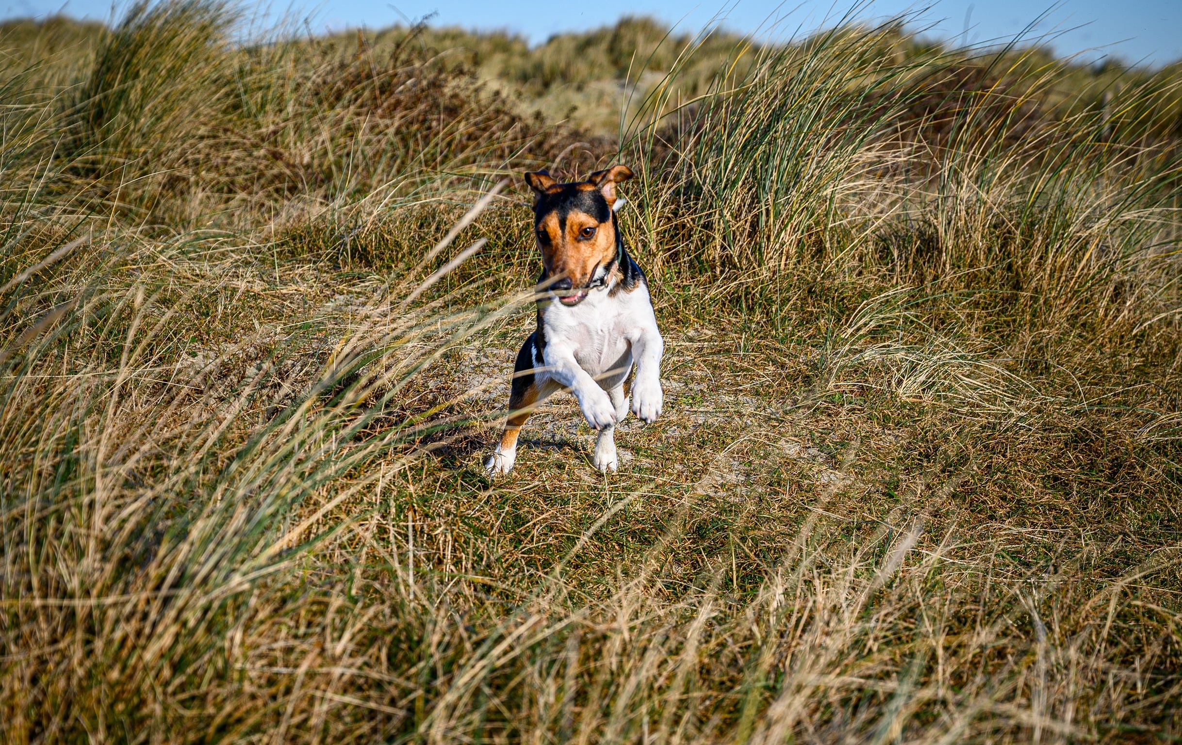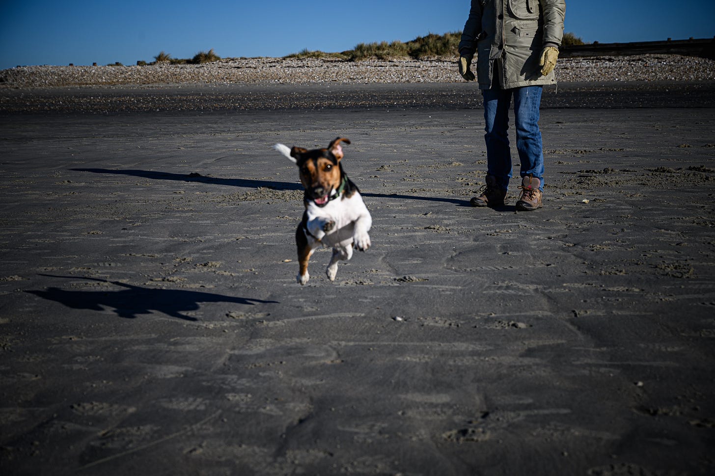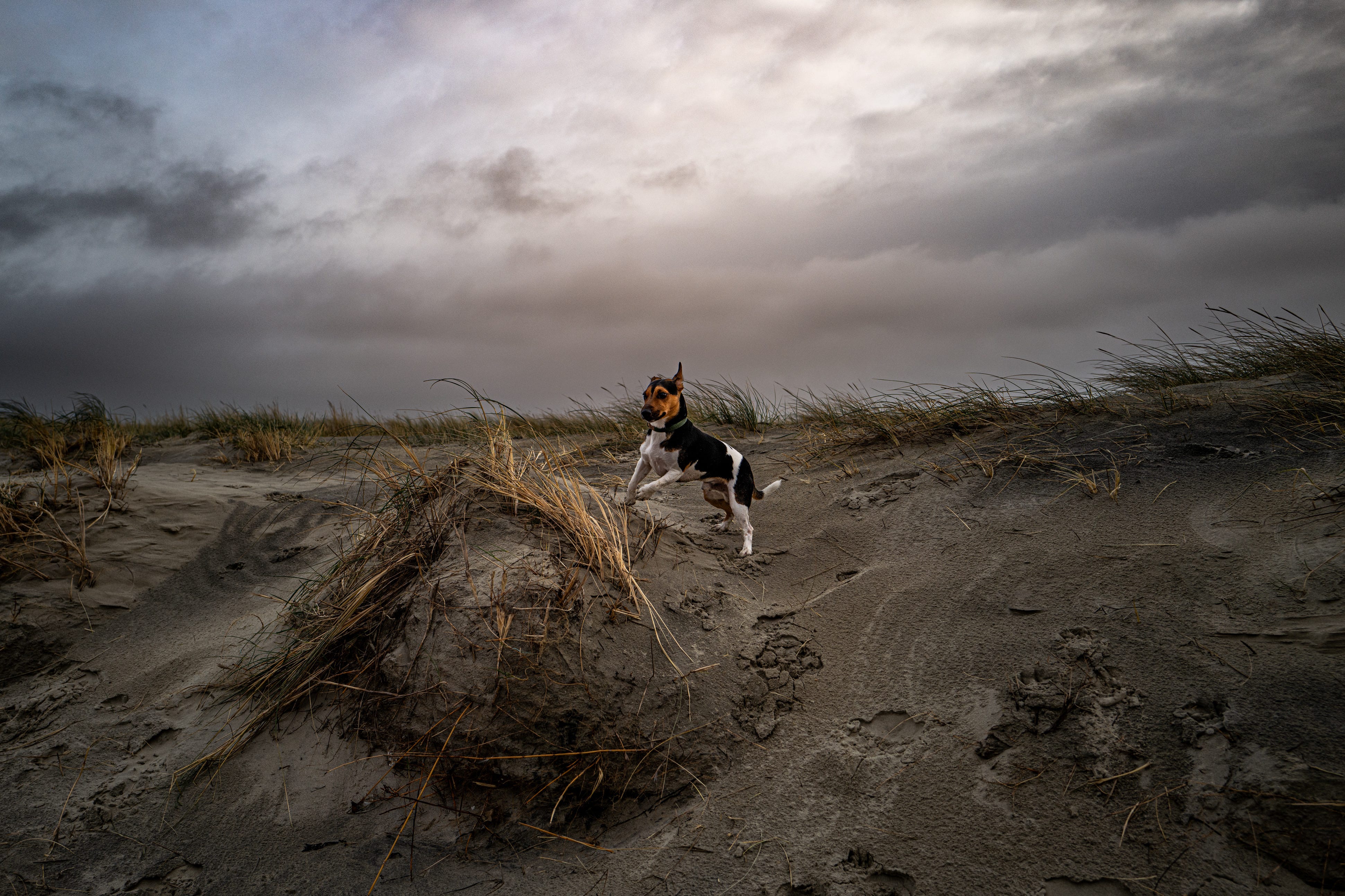 By the time I bring the viewfinder to my eye, Eddie has already moved three frames ahead. Sometimes he charges straight toward me. Sometimes he vanishes behind a dune and reappears somewhere entirely implausible. Sometimes he stands heroically at the shoreline… but only for the half-second before darting off after something only he can see.