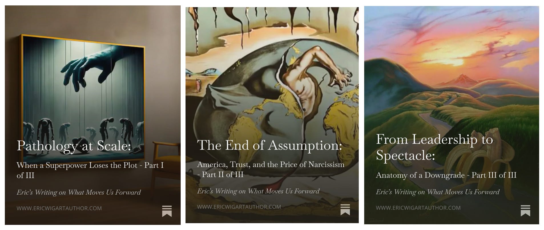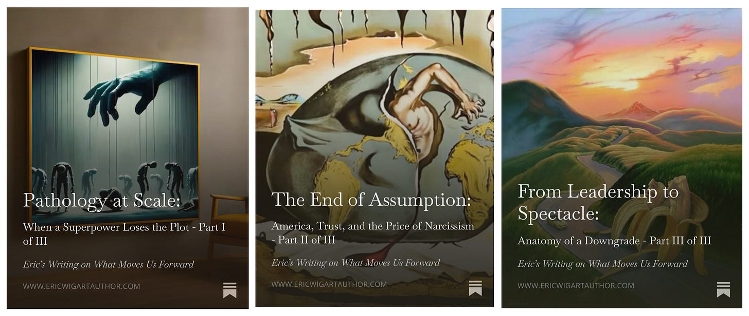 A concluding analysis of consequence rather than intent: how leadership degrades into performance, and why that downgrade permanently alters global expectations even after the spectacle fades.https://www.ericwigartauthor.com/p/from-leadership-to-spectacle